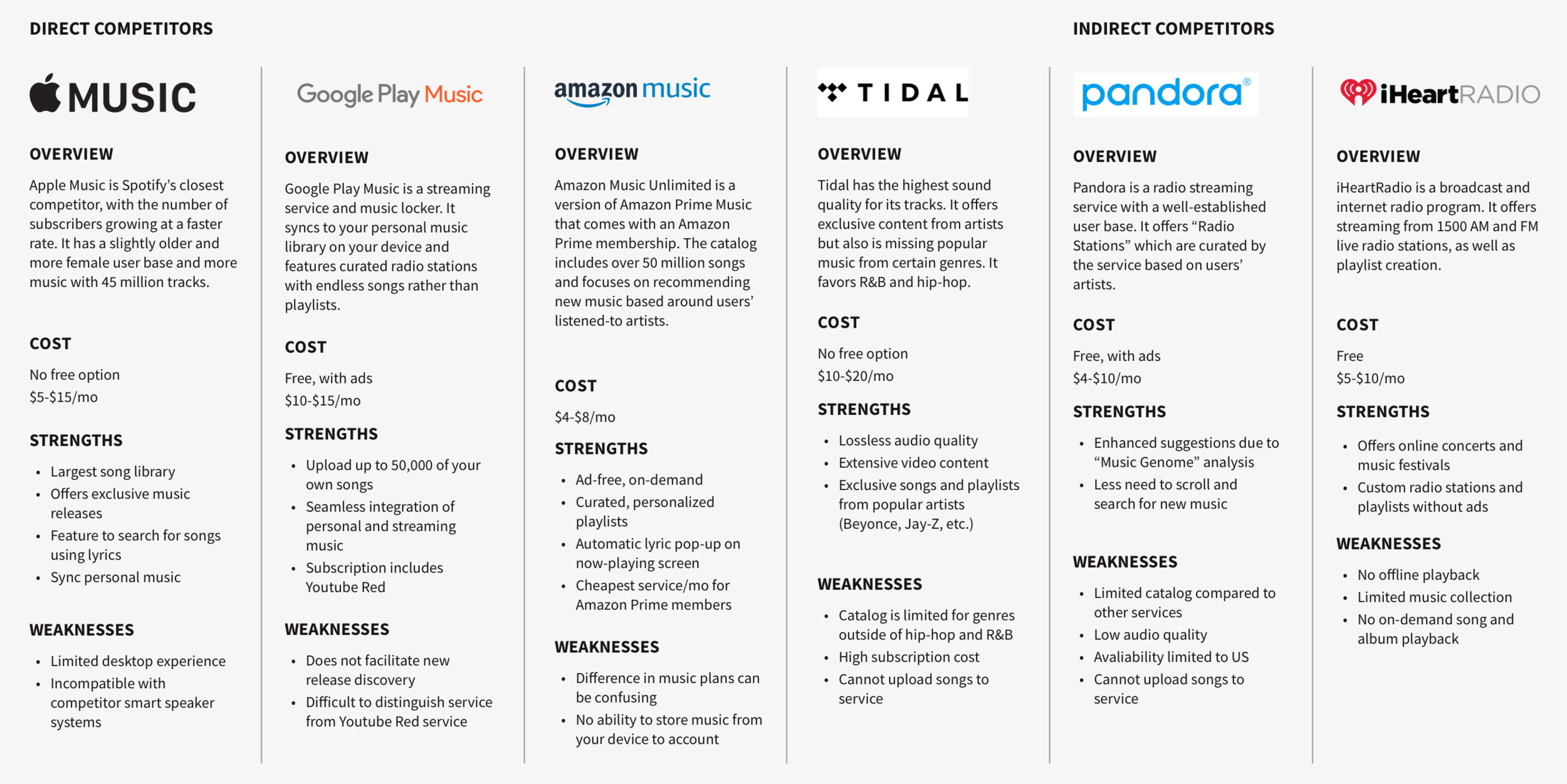 Spotify is the current leader in music streaming services, with more monthly active users than any of its competitors. I examined the those competitors, comparing their strengths and weaknesses, to understand how Spotify might distinguish itself from the rest of the market.